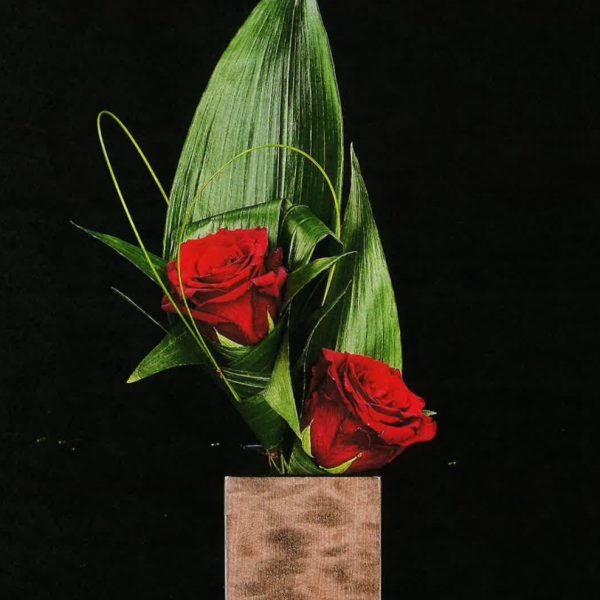 Composizione con rose rosse e aspidistra lavorata su vaso in legno laccato "SATIN WOOD"